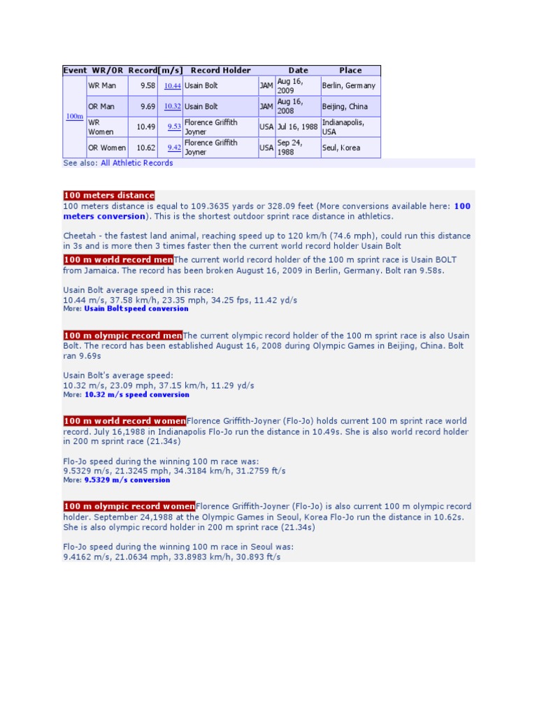 The 100 record came on a breezy day in indianapolis, but officials deemed it a legal wind. Les records olympiques de la discipline sont actuellement détenus par le jamaïcain usain bolt chez les hommes, qui établit le temps de 9 s 63 en finale des jeux olympiques. Tulsa protesters condemn reburial of remains excavated in search of massacre victims. Florence delorez griffith joyner (born florence delorez griffith; When you look closely at the women's split times, they indicate that women can hold their top speed for longer than the world's elite men can.